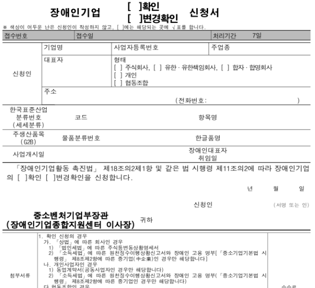 - 법인사업자 : 장애인이 대표이사 및 최대주주일 때 신청할 수 있으며, 공동대표의 경우 장애인 지분이 비장애인보다 많아야 합니다.