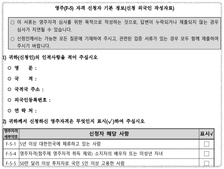 - 가족관계 기반 영주자격 : 한국 국적자 또는 영주자의 배우자, 미성년 자녀 등에게 허용