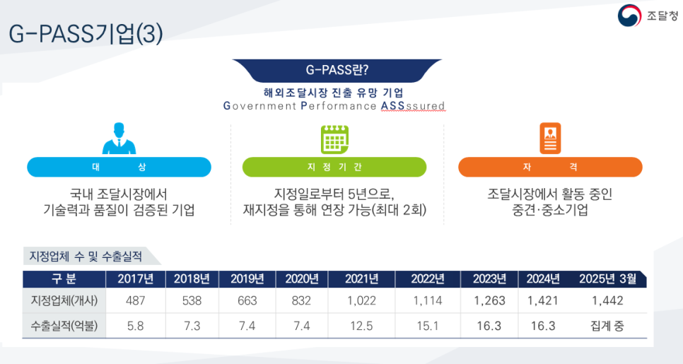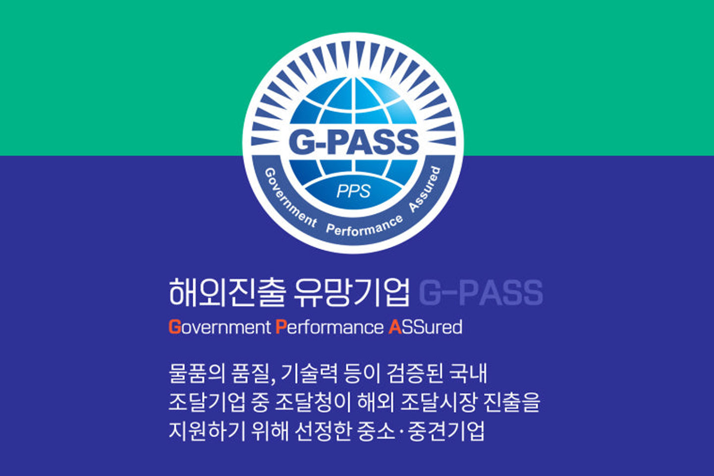 G-PASS 기업(Government Performance ASSured)은 조달청이 지정하는 해외조달시장 진출 유망 중소기업으로, 국내 공공조달 실적과 기술력, 품질 경쟁력을 인정받은 기업을 의미합니다. 즉, G-PASS 인증은 “국내에서 검증된 우수 조달제품을 가진 기업이 해외 조달시장에 진출할 수 있도록 정부가 보증한다”는 성격을 가지고 있습니다.