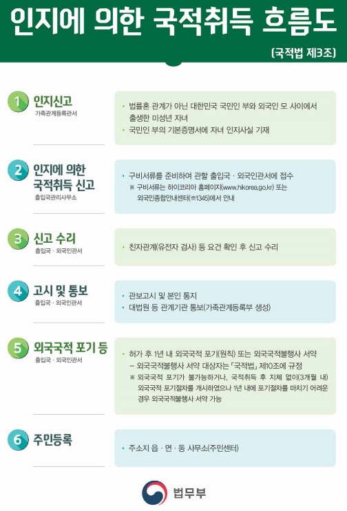 - 핵심 절차: 한국인 아버지가 먼저 자녀에 대한 '인지 신고'를 하고, 인지 사실이 아버지의 기본증명서에 기재된 후, 법무부장관에게 '국적 취득 신고'를 해야 대한민국 국적을 취득할 수 있습니다.