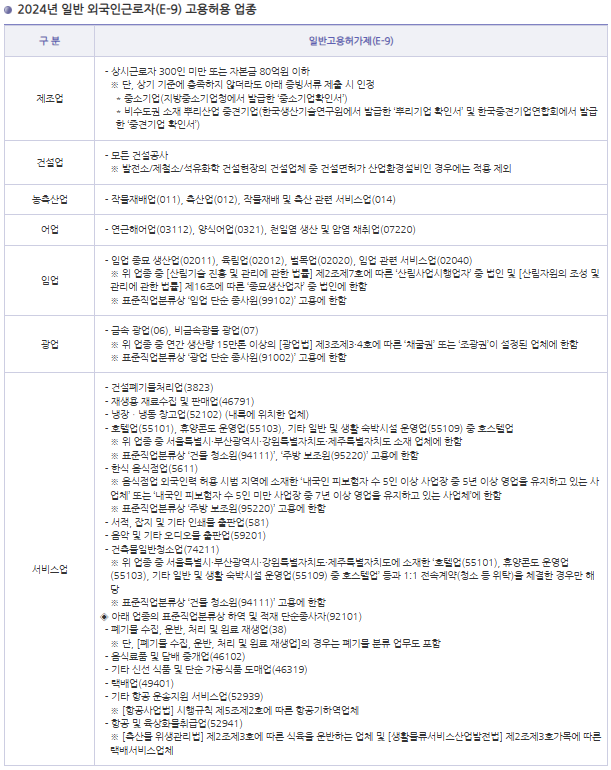 - 서비스업: 음식점업(내국인 근로자 5인 이상, 업력 5년 이상 등 일정요건 충족 시 가능), 호텔·콘도업(청소 및 주방보조직), 택배업 등 일부 업종만 허용