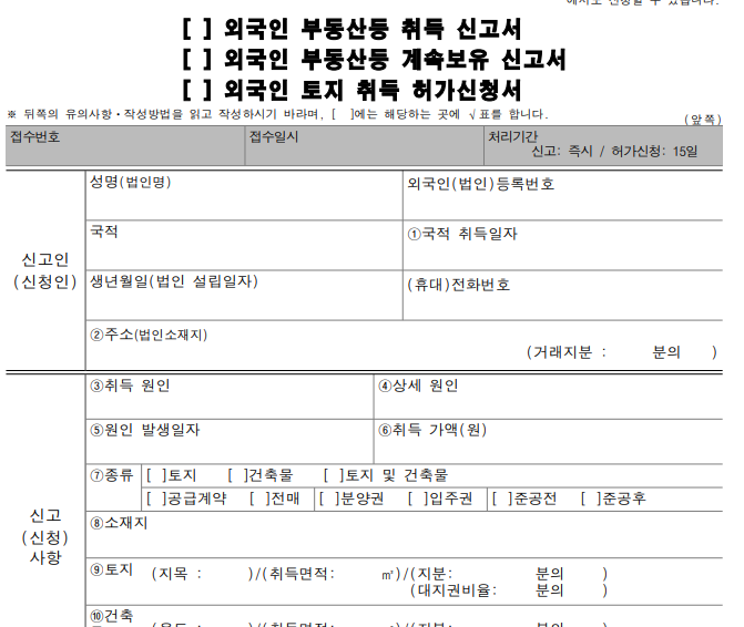 - 만약 매입 부동산이 토지 또는 토지에 해당하는 대지지분을 포함하는 경우라면, 별도의 토지취득신고 절차가 필요할 수 있으며, 경우에 따라 사전 허가가 필요한 지역(예: 군사 보호구역, 생태보전구역 등)인지 확인해야 합니다.