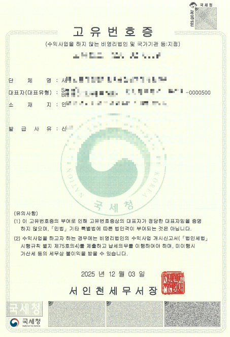 - 관할 세무서에 서류 제출: 고유번호증 발급을 신청합니다.