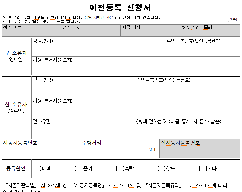 - 신청관할 자동차등록사업소에 방문하여 이전등록 신청서를 제출합니다. 이때 자동차세 체납 여부, 압류·저당 설정 여부도 함께 확인됩니다.
