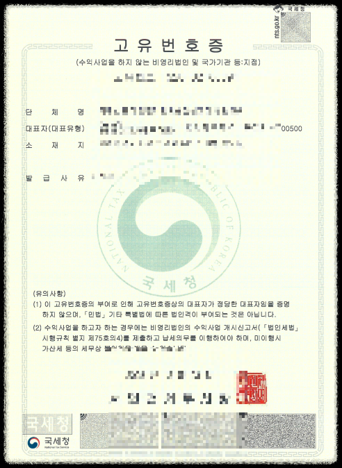 정관과 회의록을 갖춘 뒤에는 관할 세무서에 단체의 승인신청서를 제출하여 고유번호증을 발급받습니다. 고유번호증을 받으면 단체 명의로 통장 개설, 회비 및 후원금 관리, 각종 계약 등이 가능합니다.