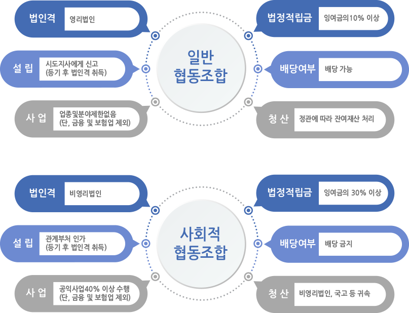 사회적협동조합은 사회서비스·취약계층 일자리 제공 등을 주된 목적사업으로 하며, 일반협동조합과 일부 설립절차 요건이 다르므로 정관 설계 시 구분이 필요합니다.