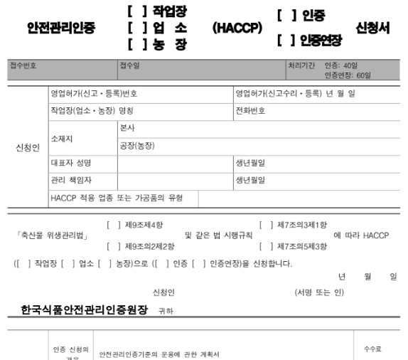 - 인증 신청: 한국식품안전관리인증원장에게 인증신청서와 계획서 등 관련 서류를 제출합니다.