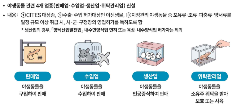 현재 제도에서는 크게 기존 법정관리종, 수출입 허가 대상 종, 지정관리 야생동물로 구분됩니다.
