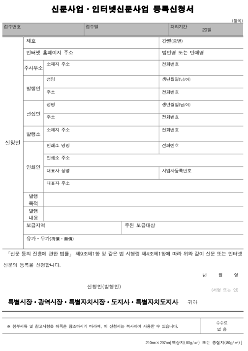 - 상호 및 제호: 다른 인터넷 신문사와 혼동되지 않는 고유한 상호 및 제호를 사용해야 합니다.