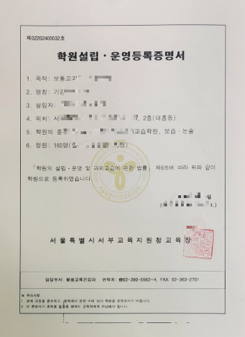 - 교육지원청 민원 접수: 학원설립·운영등록신청서, 평면도, 임대차계약서 등 서류 제출