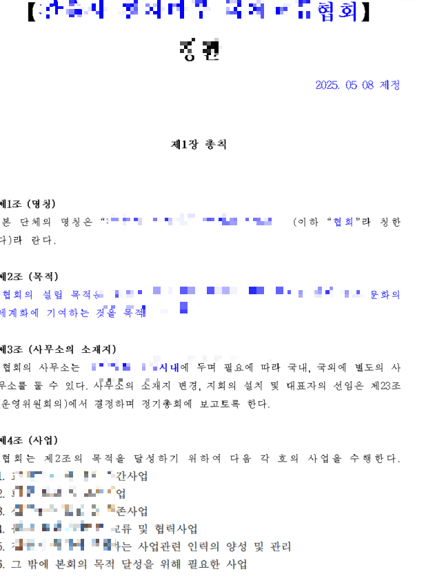- 정관 또는 회칙: 단체의 목적, 사업 내용, 구성원의 자격 및 권리/의무, 회계 등에 대한 규정을 명시합니다. 추후 지원사업의 성격에 맞춰 유연하게 수정할 수 있도록 너무 세부적인 내용보다는 큰 틀을 제시하는 것이 좋습니다.